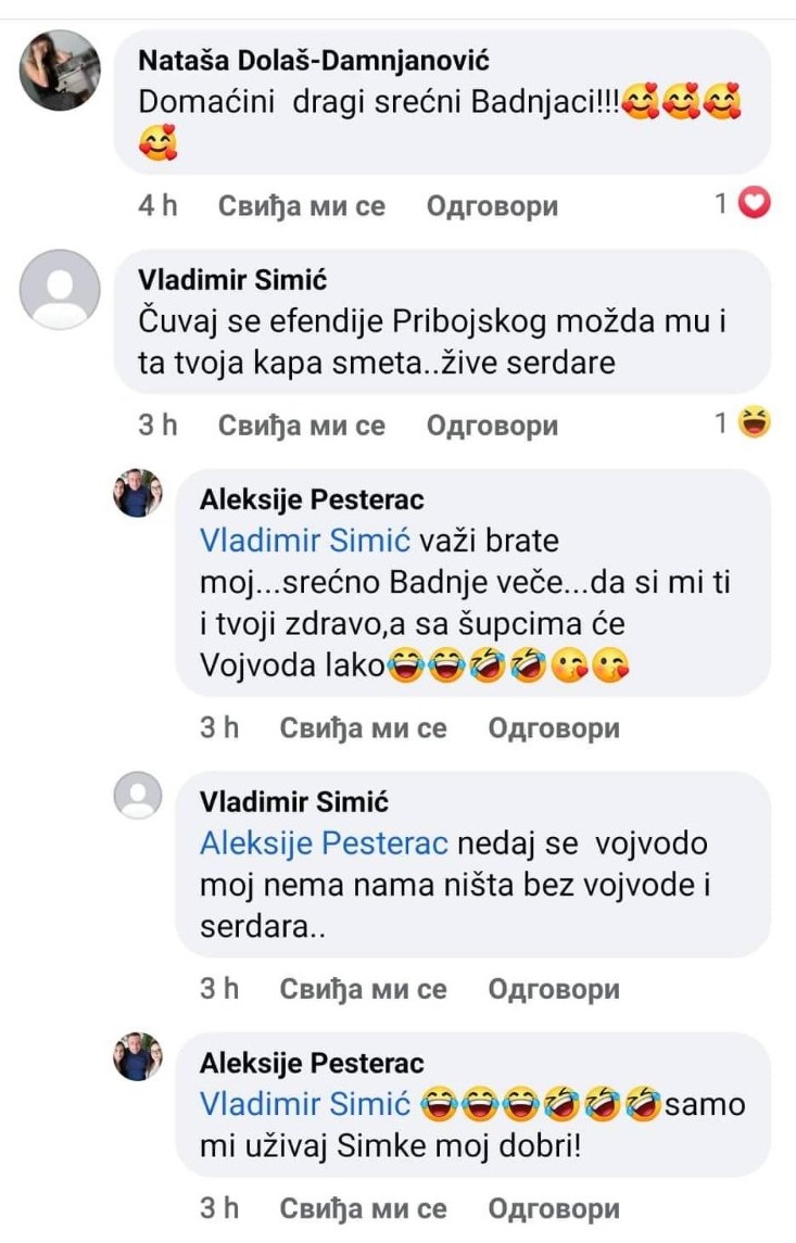 No, ni tu nije kraj. Na društvenim mrežama u istoj noći osvanule su uvrede i prijetnje pribojskim imamima, izrečene u javnoj komunikaciji policajaca Vladimira Simića i Aleksija Pešterca.