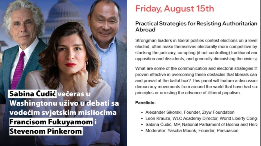 Dakle, 14. augusta će se održati debata u kojoj učestvuju Fukuyama i Pinker i tema je – Liberalizam u vrijeme ustavne krize: Bilans stanja američke demokratije.