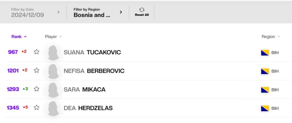Nefisa Berberović (25) je također nazadovala za dvije pozicije i sada je 1.201. teniserka svijeta, dok je Sara Mikača (21) napredovala sa 1.296. na 1.293. poziciju.