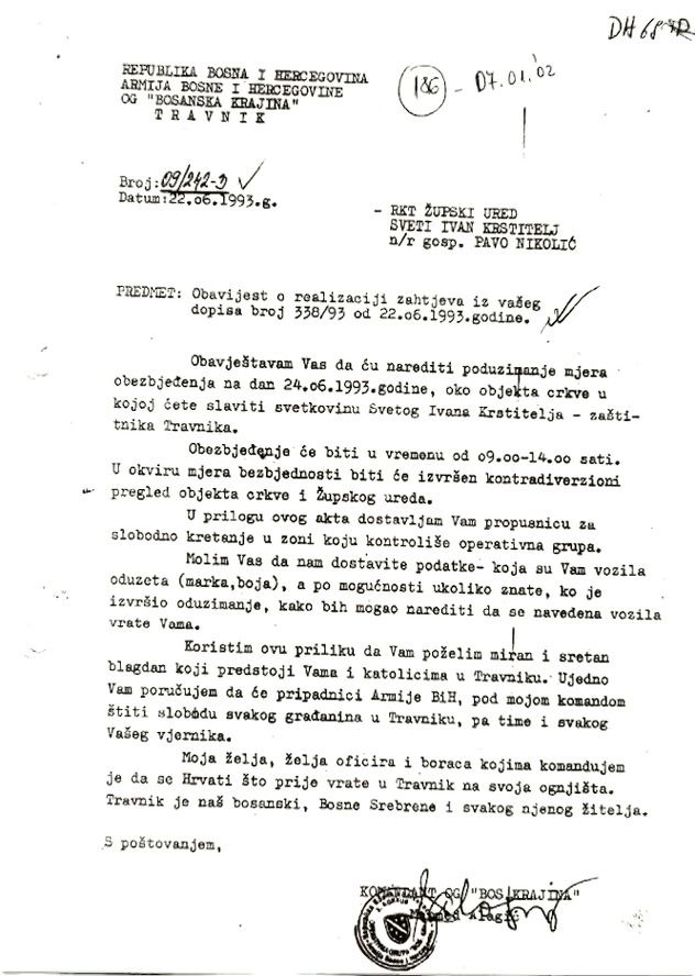 “Moja želja, želja oficira i boraca kojima komandujem je da se Hrvati što prije vrate u Travnik na svoja ognjišta. Travnik je naš bosanski, Bosne Srebrene i svakog njenog žitelja”, stoji u zaključku naredbe koju je potpisao Alagić 22. jula 1993. godine.