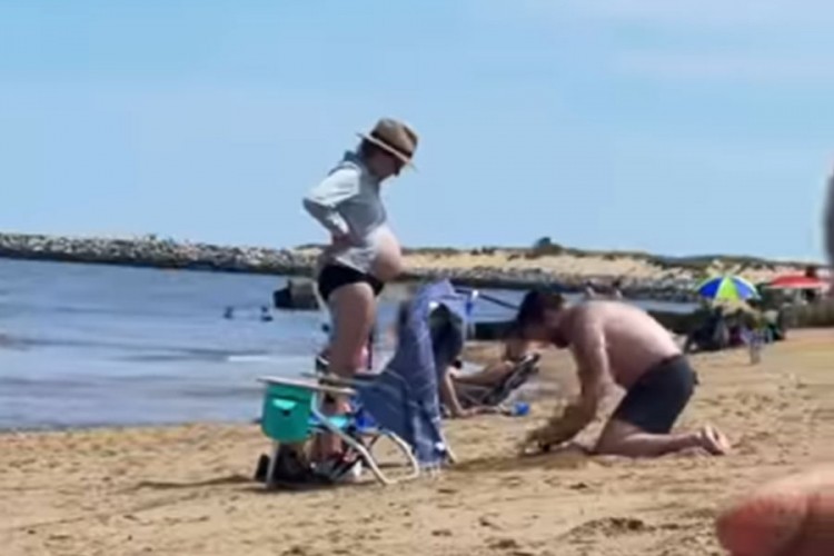 Na snimku se vidi kako muškarac kopa rupu na plaži kako bi u nju stao stomak njegove trudne supruge.