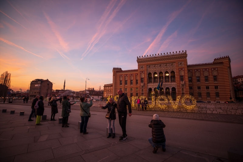Sunce je na poslijetku priredilo i spektakularni zalazak koji su fotoreporteri AA zabilježili te trenutke u kojima su se boje na nebu stapale sa onim na površini Miljacke, kao i onim na Vijećnici i ćuprijama koje su još uvijek okićene novogodišnjim ukrasima.