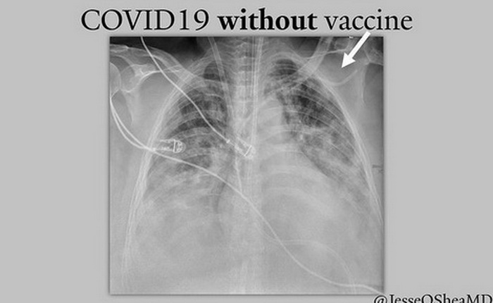 Dr. Jesse O'Shea infektolog, objavio je rendgen snimak koji pokazuje razliku u plućima dva njegova pacijenta. Jedan je vakcinisan protiv Covida 19, dok drugi nije primio vakcinu. Razlika je zapanjujuća.