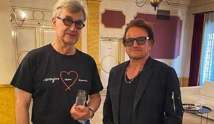 Na njoj je Bono u društvu sa Wendersom u Narodnom pozorištu gdje će danas biti upriličena i projekcija restaurirane verzije njegovog filma “Hotel od milion dolara”.
