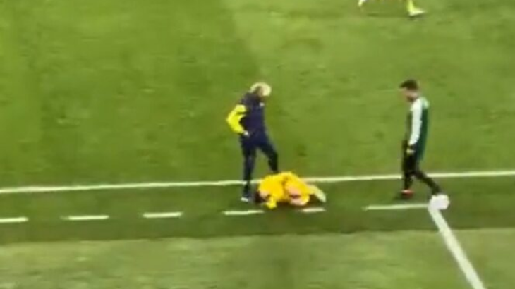 Četvrti arbitar je sve to gledao sa strane, povređenom igraču su prišli ljekari, nakon čega je Jesus po glavi dodirnuo fudbalera.