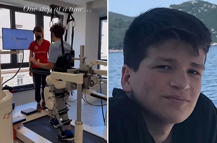 Snimak prikazuje 17-godišnjeg Orhana dok uz pomoć medicinskog uređaja polako korača na traci.