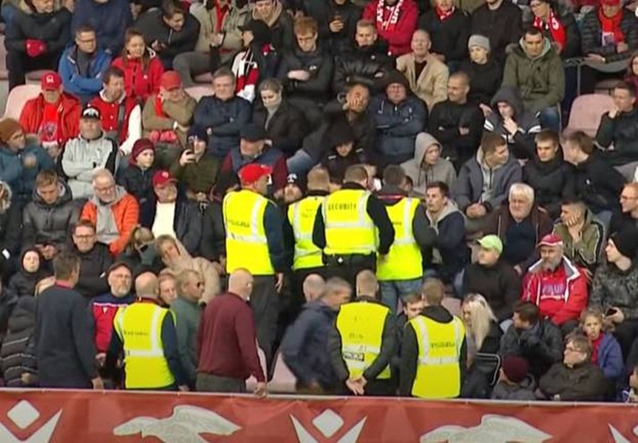 Koncem prvog poluvremena zaštitari su izbacili desetak Dinamovih navijača s tribine domaćeg stadiona. Razlog je u tome što UEFA ne dopušta gostujućim navijačima dolazak na utakmice, piše Index.hr.
