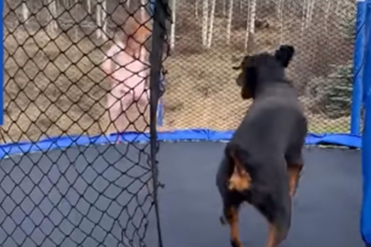 Na snimku se vidi kako se djevojčica zabavlja skačući na trampolini, a društvo joj pravi ženka rotvajlera.