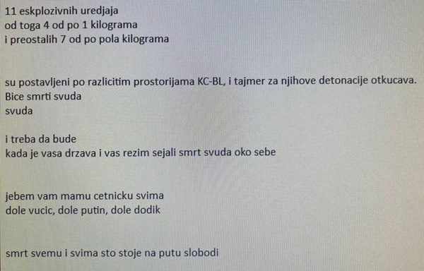 – Јedanaest eksplozivnih uređaja od toga četiri od po jedan kilogram i preostalih sedam po pola kilograma postavljeni su u UKC Srpske i tajmer za njihove detonacije otkucava – navodi se u poruci.