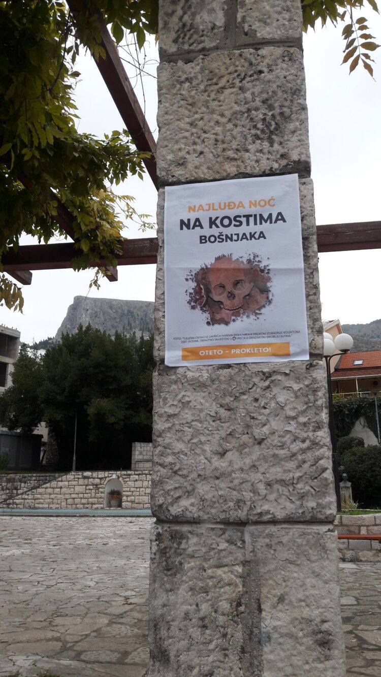 Jutros su osvanuli šokantni plakati. Na plakatima su fotografije lobanje i kostiju za koje se navodi da je riječ o “tjelesnim ostacima iz Lakišića harema ekshumiranih prilikom izgradnje kolektora 2017. godine, trenutno smješteni u sedam vreća u Gradskom grobolju Sutina”.