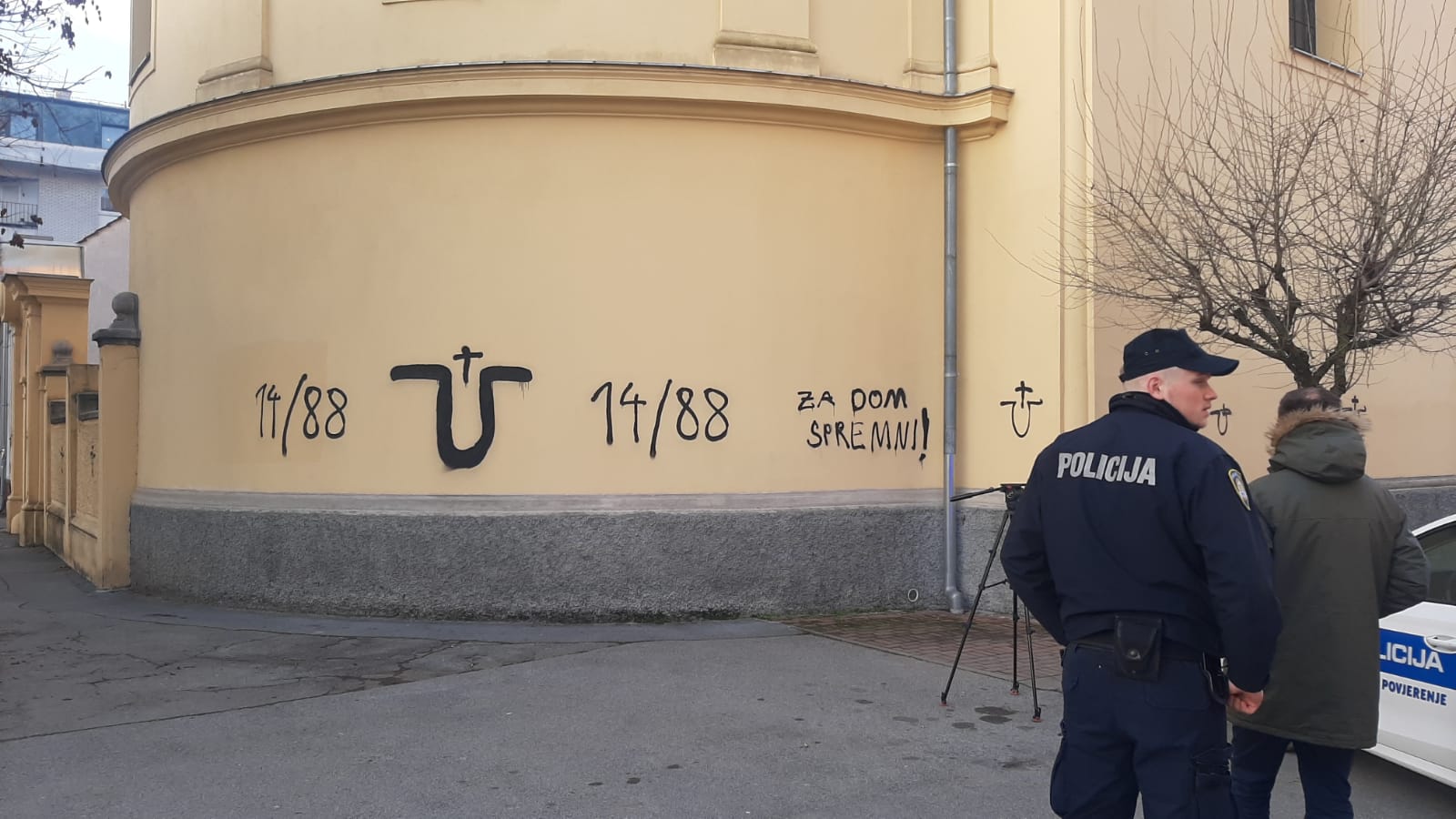 Na crkvi se tako trenutno nalazi natpis Za dom spremni i ušato slovo U te 14/88 numerološka kombinacija brojeva koja je u širokoj uporabi među neonacistima. 14 je simbol za slogan “14 riječi” (“We must secure the existence of our people and a future for white children”), a 88 za “Heil Hitler” (H je osmo slovo abecede), prenosi Index.hr.