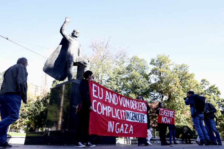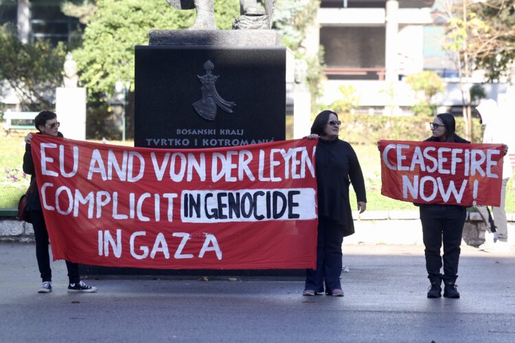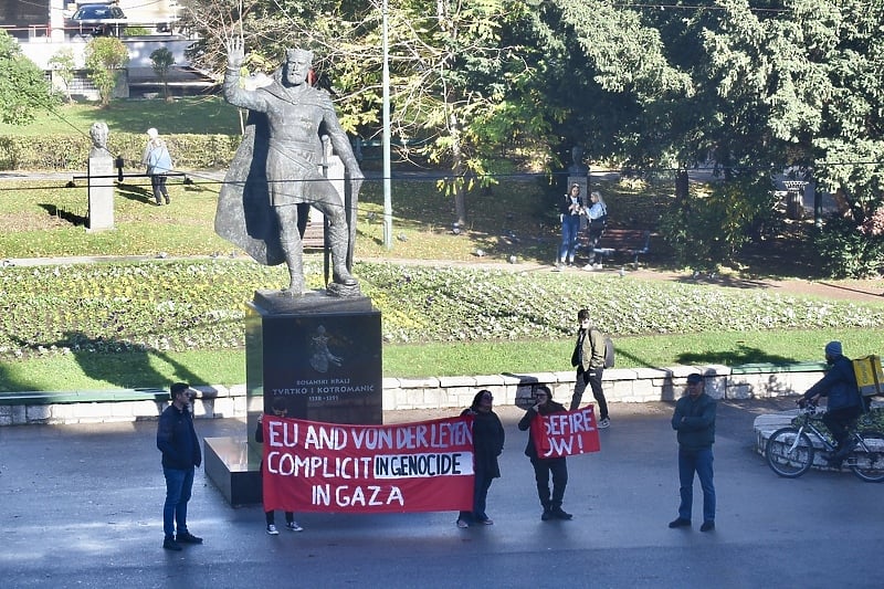 Dok u Predsjedništvu BiH traje susret predsjednice Evropske komisije Ursule von der Leyen sa članovima državnog predsjedništva, ispred zgrade ove institucije okupila se manja neformalna grupa građana koja protestuje.