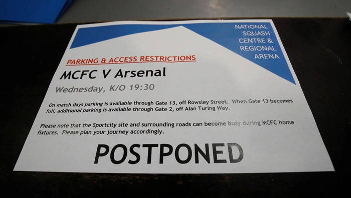 City i Arsenal je trebalo da igraju večeras od 21:00 sati u Mančesteru utakmicu 28. kola Premier lige, ali je odložena iz bezbijednosnih razloga, prenosi Beta.