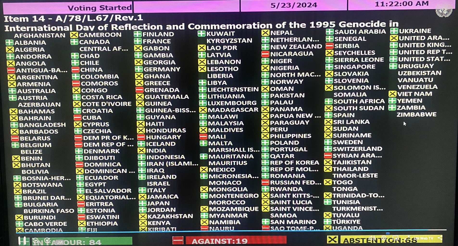 84 države su glasale “za”, a to su: