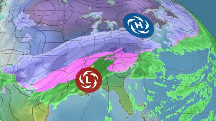 Obilne snježne padavine će se nagomilavati na širokom području sjeverno od zone ledene kiše koju predstavlja oluja.