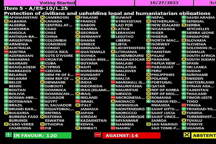 Rezolucija koju je u ime Arapske lige predložio Jordan poziva na trenutno, trajno i održivo humanitarno primirje koje vodi do prekida neprijateljstava. Samo 14 država je glasalo protiv, a među njima i pet članica Evropske unije.