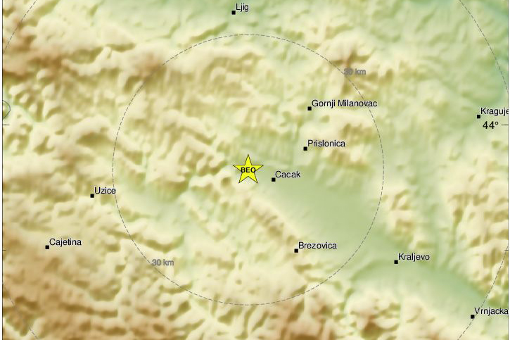 Večeras nešto poslije 20.30 sati zatreslo se tlo kod Čačka koji se osjetio 52 kilometra jugozapadno od Kragujevca i šest kilometara zapadno od Čačka.