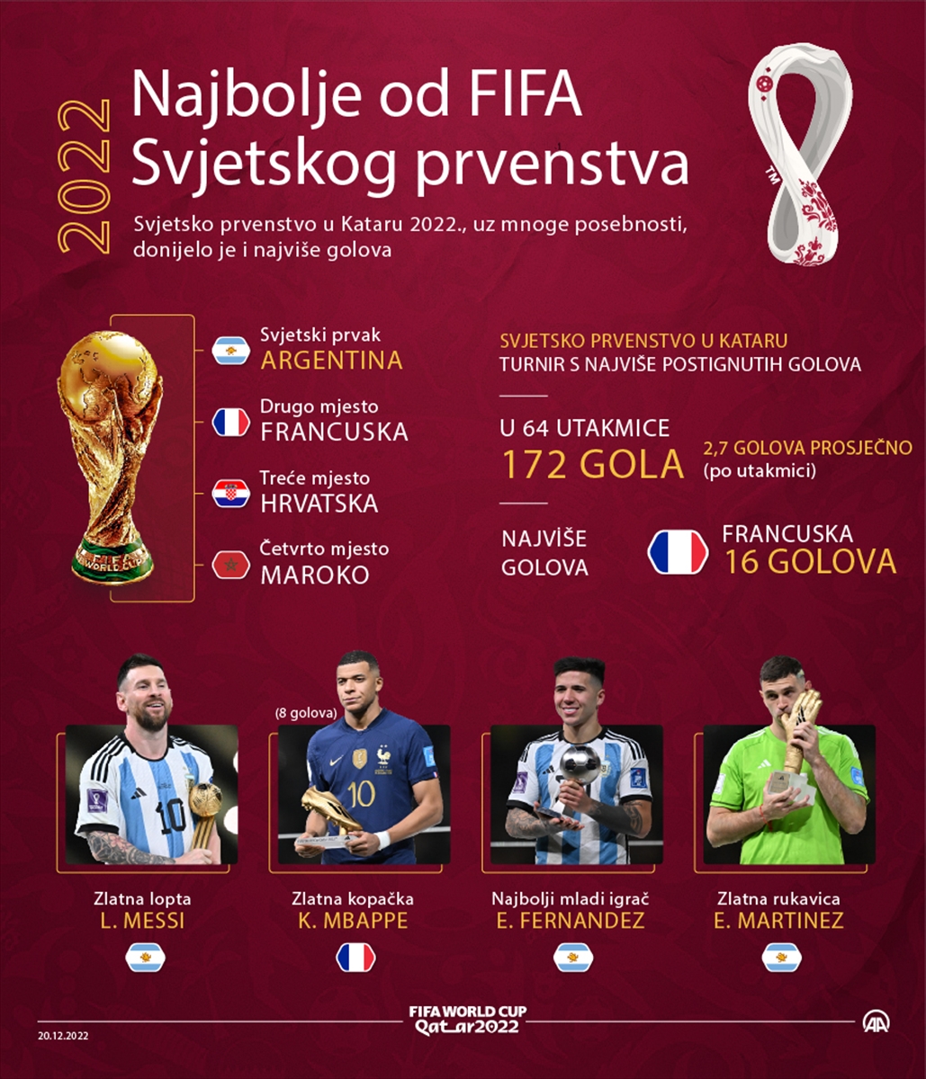Svjetsko fudbalsko prvenstvo u Kataru okončano je 18. decembra spektakularnom finalnom utakmicom između Argentine i Francuske u kojoj su Argentinci slavili nakon boljeg izvođenja jedanaesteraca rezultatom 4:2, a prethodno je bilo 2:2 nakon 90 i 3:3 poslije 120 minuta igre.