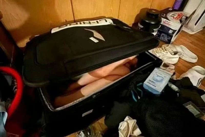 Na fotografiji koja je objavljena na internetu, vidi se njegova djevojka sklupčana u velikom crnom koferu, a oko njega su razbacane odjeća i obuća.