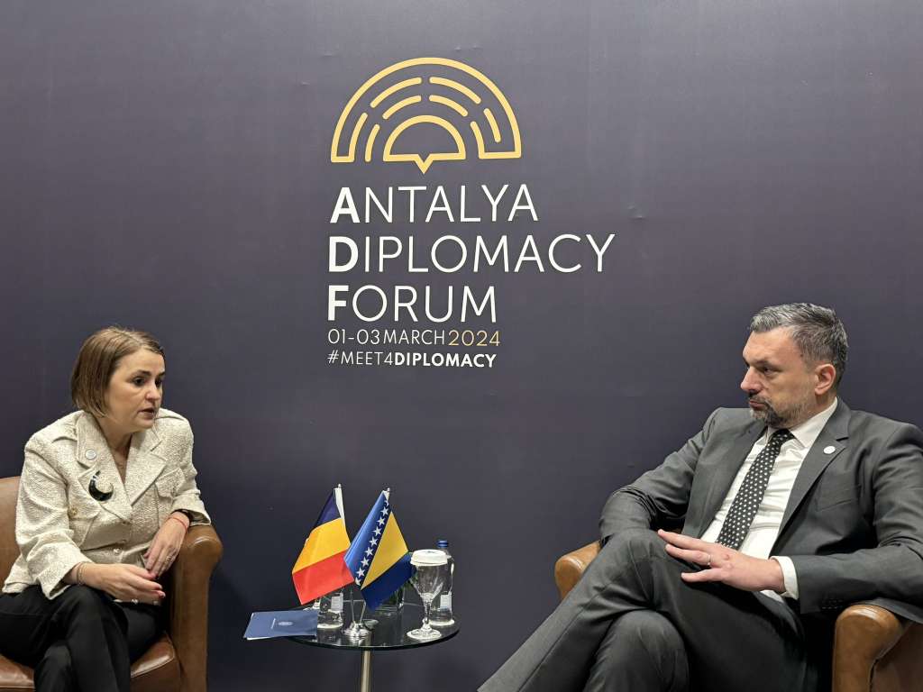 Ministar vanjskih poslova Bosne i Hercegovine Elmedin Konaković na marginama „Antalya diplomatskog foruma“ susreo se danas sa ministricom vanjskih poslova Rumunije Luminitom Teodorom Odobescu, a razgovarali su o unutrašnjopolitičkoj situaciji u Bosni i Hercegovini i o njenim vanjskopolitičkim ciljevima.