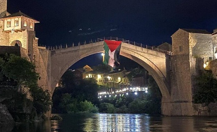 Građani Mostara su razvijanjem velike zastave Palestine na Starom mostu izrazili podršku Palestincima koji trpe nasilje od Izraela.