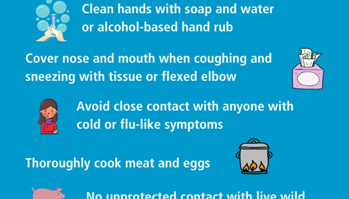 Savjetuje se i izbjegavanje bliskog kontakta s osobama koje imaju akutnu respiratornu infekciju; izbjegavati bliski i nezaštićen kontakt sa živim i uginulim životinjama. Preporučuju i često pranje ruku, posebno nakon kontakta sa bolesnicima i njihovom okolinom, kao i termičku obradu namirnica, posebno mesa.