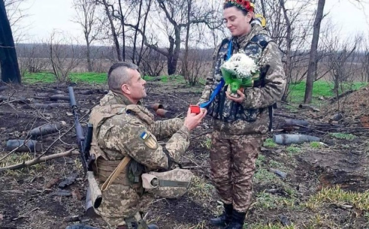 Ministarstvo odbrane Ukrajine na Twitteru je objavilo fotografiju na kojoj vojnik prosi svoju djevojku, koja je također pripadnica vojske.