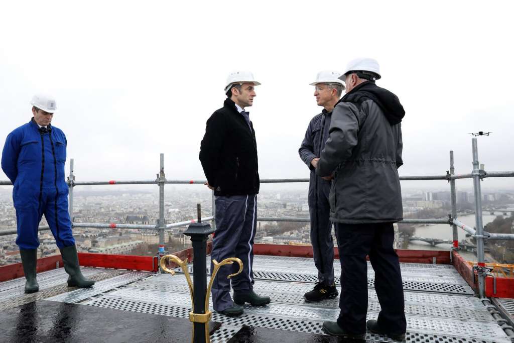 Sa skele na vrhu novoizgrađenog tornja Notre-Damea, francuski predsjednik Emmanuel Macron obećao je u petak da će obnova katedrale razorene požarom biti završena prema planu i da će ponovo biti otvorena za godinu dana.