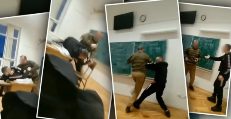 U međusobnom kontaktu, došlo je hrvanja i guranja, ali i do obaranja učenika na katedru. Pri kraju snimka, vidi se da učenik gura profesora, nakon čega je profesor napustio učionicu.
