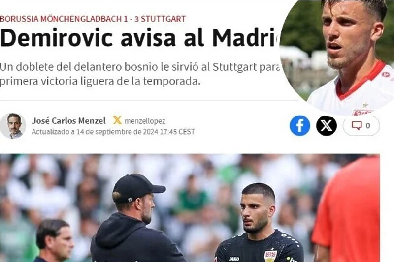 “Demirović upozorava Madrid”, stoji u naslovu, a u nadnaslovu se objašnjava: “Dva gola bosanskog napadača za prvu ligašku pobjedu u sezoni”.