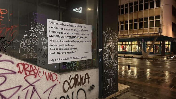 “Ako se ne budu vidjeli ozbiljni pomaci u načinu rada, u zalaganju, rezultatima i načinu ponašanja na terenu, svi trebamo snositi odgovornost, prva ja. Nije se cilj samo kvalifikovati, nego i ostvariti dobar rezultat u Evropi.” Ajla Alimanović 29.12.2022., stoji na plakatu u blizine službenih prostorija FK Sarajevi u ulici Titovoj 38B.