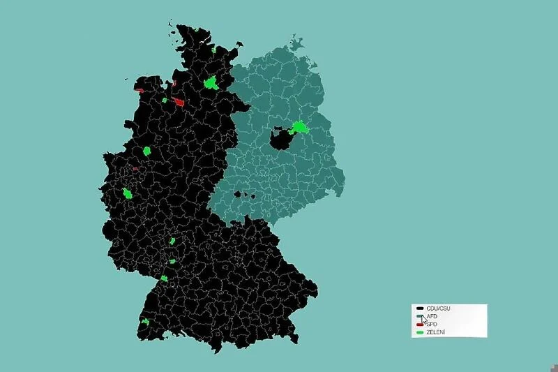 Nasuprot tome, AfD dominira u “novim” saveznim državama nekada dijelovima DDR-a. Jedini izuzeci su savezna prijestolnica Berlin i susjedni Potsdam (Zeleni) ili Potsdam-Mittelmark te gradovi Jena, Weimar i Erfurt (CDU).