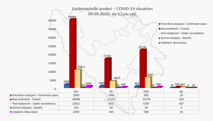 Kako je saopćeno iz ovog Ministarstva, do 12 sati u BiH je zabilježeno ukupno 2090 slučajeva zaraze novim korona virusom. Ukupno su preminule 102 osobe dok se 1059 osoba oporavilo.