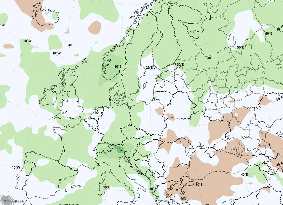 Padavine će biti oskudne u većem dijelu centralne i sjeverne Evrope, dok će nešto više kiše pasti na krajnjem sjeveru, na primjerice nad dijelovima Ujedinjenog Kraljevstva i Skandinavije.