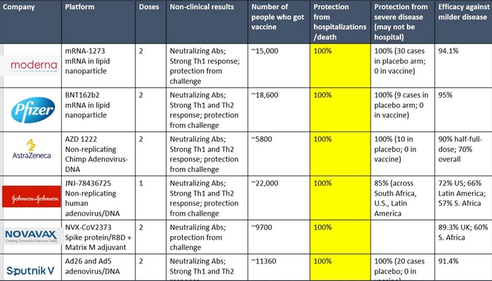 Tablica prikazuje pregled rezultata kliničkih ispitivanja šest najpoznatijih cjepiva protiv covida-19. To su redom cjepiva Moderne, Pfizera, AstraZenece, Johnsona&Johnsona, NovaVaxa i rusko cjepivo Sputnjik V.