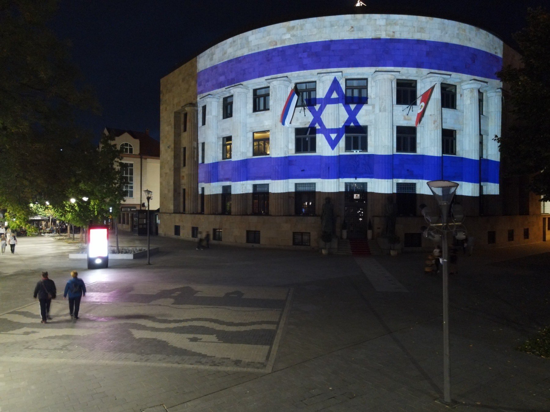 Palata RS večeras je u bojama izraelske zastave kao znak solidarnosti nakon napada Hamasa na Izrael koji je za posljedicu imao više stotina mrtvih i nekoliko hiljada ranjenih.