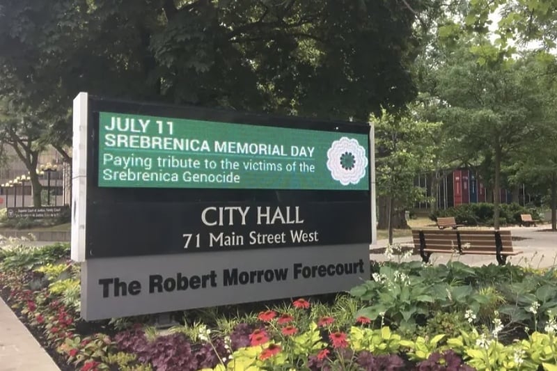 Na velikom elektronskom panou ispred Skupštine Hamiltona je napisano: “11. juli Dan sjećanja na Srebrenicu. Odajemo počast žrtvama genocida u Srebrenici”. Historijski elektronski simbol Hamiltina je uoči 11. jula u zelenoj i bijeloj boji, bojama Cvijeta Srebrenice, u čast žrtava genocida u Srebrenici. Zastava BiH je postavljena na jarboj ispred Skupštine Hamiltona u počast žrtvama genocida u Srebrenici.