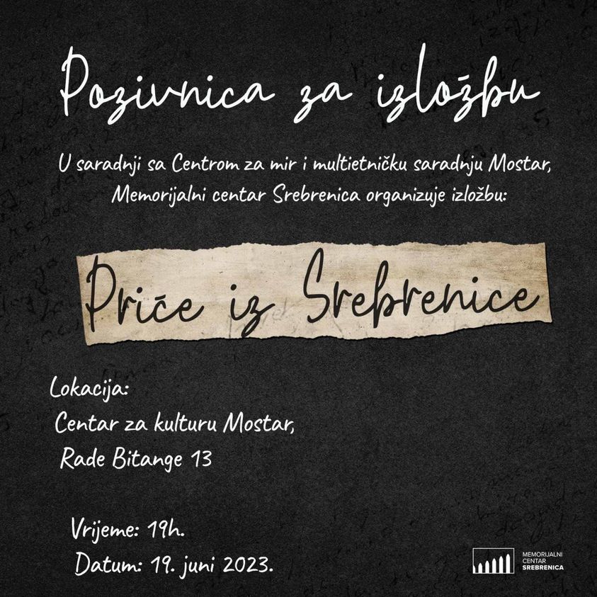 Pozivamo Vas na izložbu “Priče iz Srebrenice” čiju će prezentaciju u Centar za kulturu Mostar u ponedjeljak 19.06.2023. u 19:00 sati, upriličiti Srebrenica Memorial Center u saradnji s Centar za mir i multietničku saradnju Mostar.