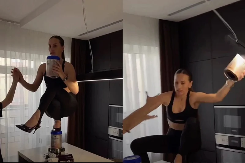 Barutkina (32) je pokušala izvesti izazov na kuhinjskom pultu, balansirajući na teglici dječje hrane, dok je nosila cipele s visokim potpeticama.