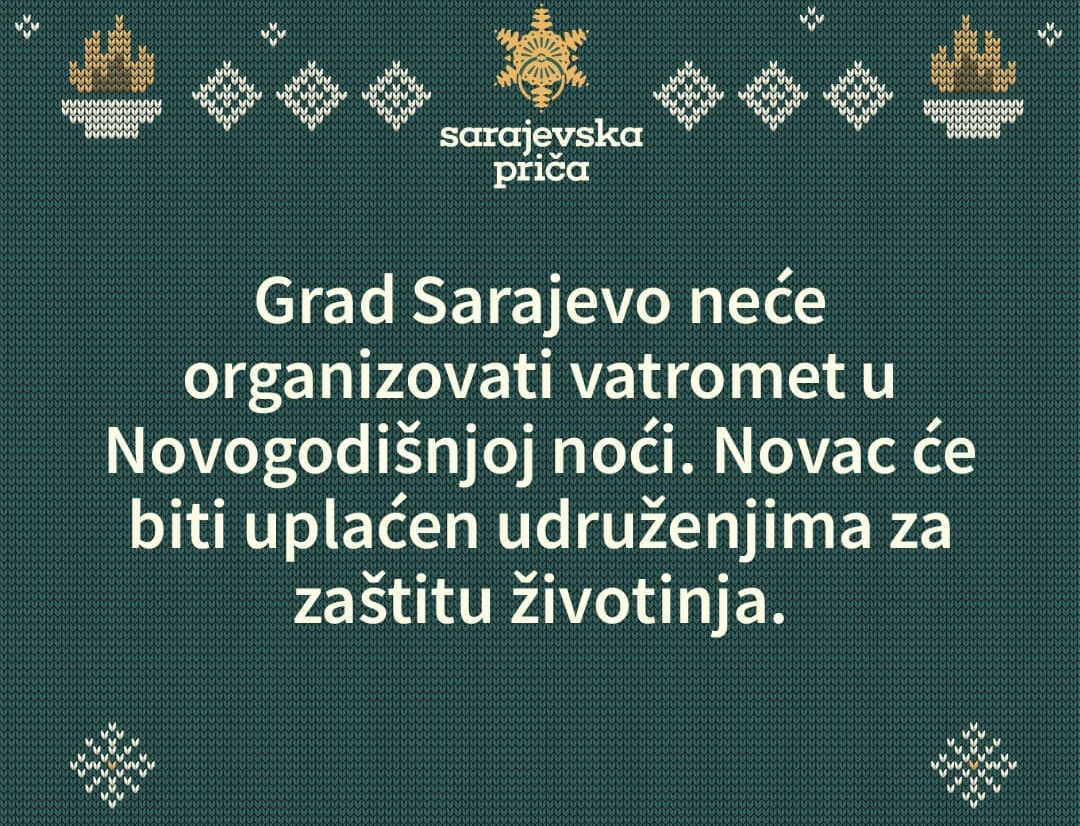 Grad Sarajevo neće organizovati vatromet u novogodišnjoj noći. Pridružili smo se velikom broju evropskih gradova koji su donijeli istu odluku, među kojima su Rim, Prag, Zagreb, Helsinki, Varšava i drugi. Novac koji bi bio predviđen za vatromet će biti uplaćen udruženjima za zaštitu životinja, napisla je gradonačelnica Sarajeva Benjamina Karić na svom Facebook profilu.