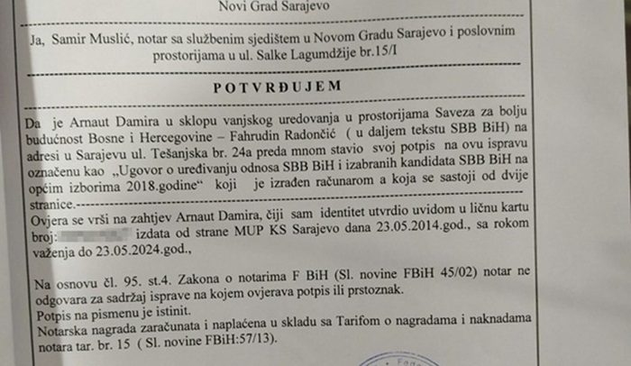 Dodatno, autor inoviranog notarskog ugovora za sve poslanike i kandidate za izbore 2018. godine lično je gospodin Damir Arnaut, navode iz SBB i dodaju: