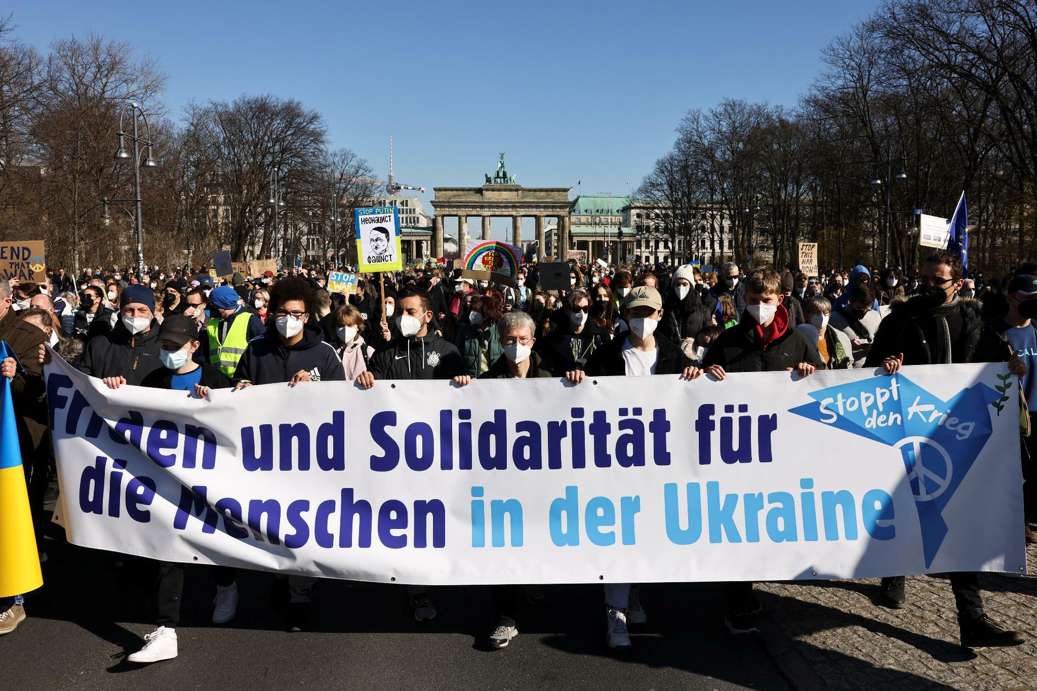 U Berlinu se hiljade ljudi okupilo na Alexanderplatzu i marširalo do Brandenburške kapije uzvikujući antiratne slogane i noseći balone u bojama ukrajinske zastave.