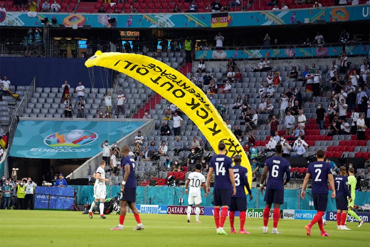 Aktivista Greenpeacea spustio se večeras padobranom na stadion Alians arena u Minhenu pred utakmicu prvog kola Evropskog prvenstva u fudbalu između Njemačke i Francuske.