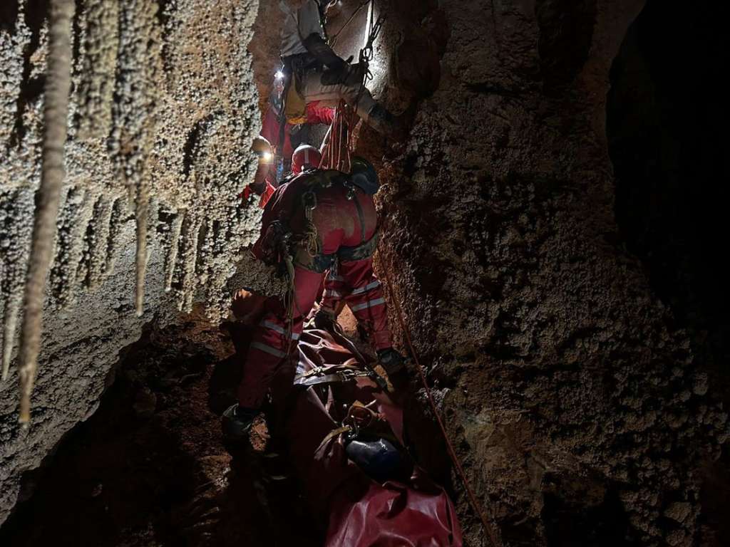 Tročlana porodica i dvoje vodiča ostali su zarobljeni u jami od subote, kada im je visok vodostaj i naglo podignut nivo vode u prećini blokirala izlaz. Zatočeni su bili na oko 2,4 kilometra od ulaza.
