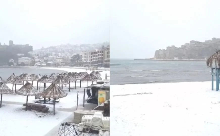 Video koji je objavila Televizija Teuta prikazuje plažu na kojoj je napadao snijeg, a u ostatku zemlje veliki udari vjetra koji prave probleme sa strujom.
