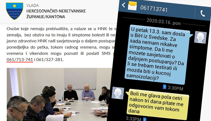 Kako nije boravila niti u jednoj od navedenih zemalja, prošla je kontrolu bez daljnih instrukcija i pitanja.U ponedjeljak se, ponukana ozbiljnošću situacije u zemlji, odlučila samovoljno prijaviti na broj telefona koji je za kontakt naveo Krizni štab Ministarstva zdravstva HNK.