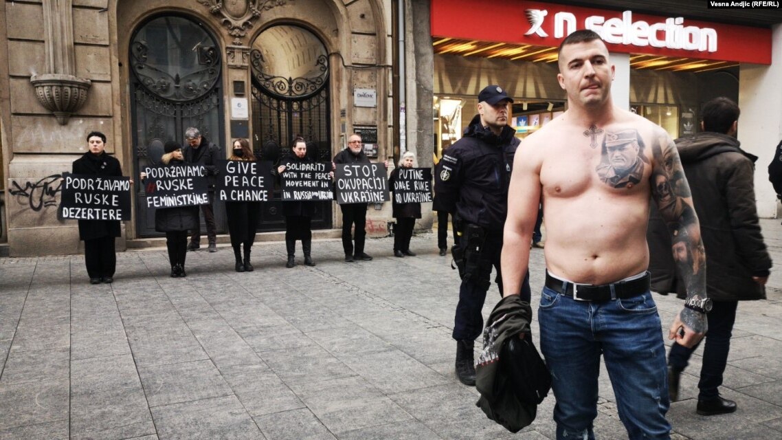 Jedan od njih skinuo se do pojasa i stao ispred aktivista, pokazujući svoju tetovažu portreta osuđenog ratnog zločinca Ratka Mladića i tetovažu grba Srbije.