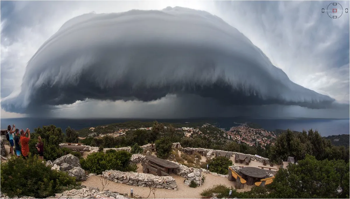 Ti prizori nisu bili nimalo ohrabrujući. Ovaj niski, vodoravni oblak tamne baze najčešće se formira na čelu snažnih grmljavinskih oluja, a ljubitelji meteorologije i lovci na oluje često ga nazivaju i cumulonimbus shelf cloud.