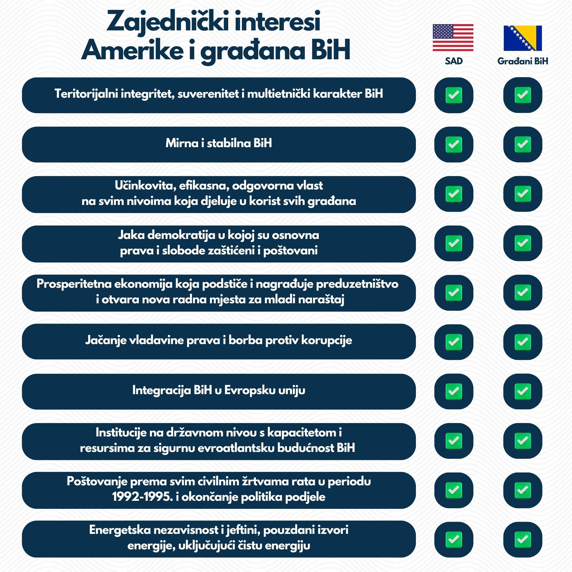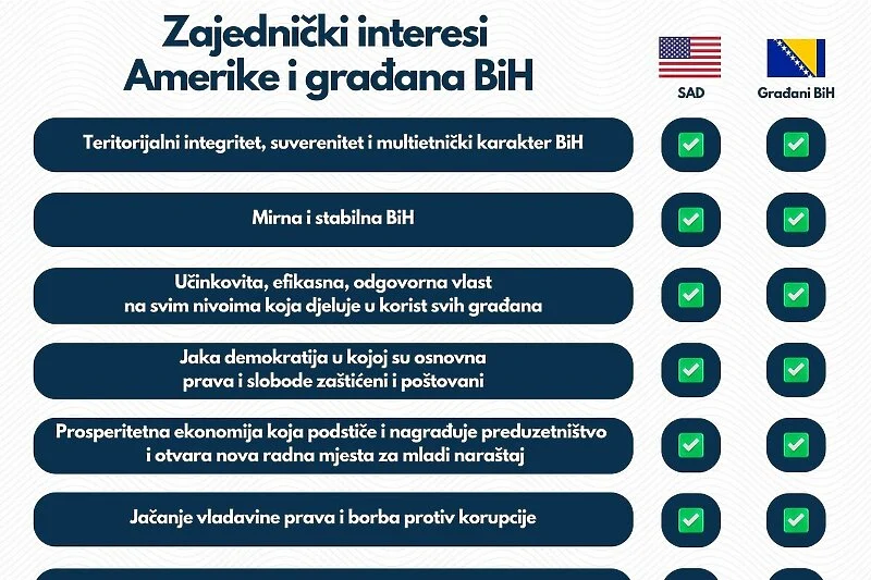 Brojni su zajednički interesi Sjedinjenih Američkih Država i građana Bosne i Hercegovine, a u posljednjoj objavi na platformi X Američka ambasada u BiH je objavila cijelu listu.