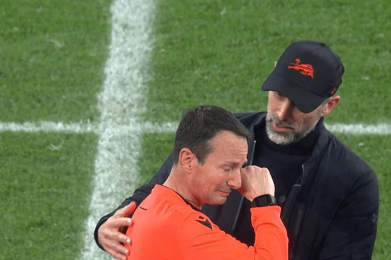 Italijanski sudija je plakao nakon posljednjeg zvižduka njegovog kolege Maurizija Marianija i djelovao je veoma potreseno nakon čega mu je prišao trener Leipziga i tješio ga.